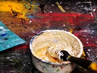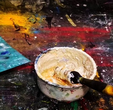 Stoop’s approach to painting is intuitive, meditative, and deeply performative. Using oils, pigments, and industrial tools, he creates layered compositions that speak to the cosmic, the transcendental, and the chaotic energy of the universe. His works invite viewers into a space of transformation, where each painting serves as a portal into an unfolding emotional and spiritual journey.